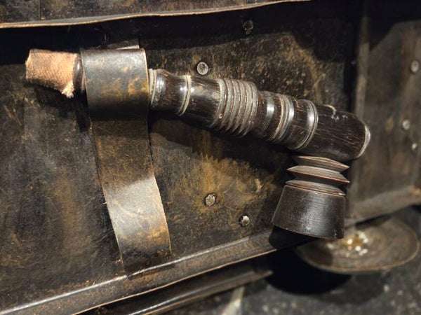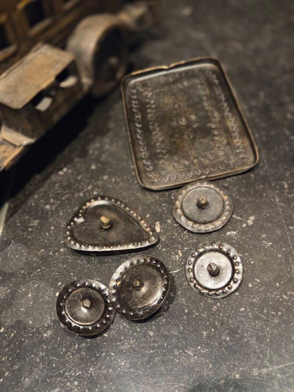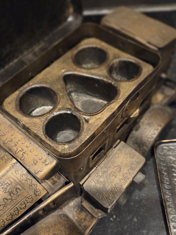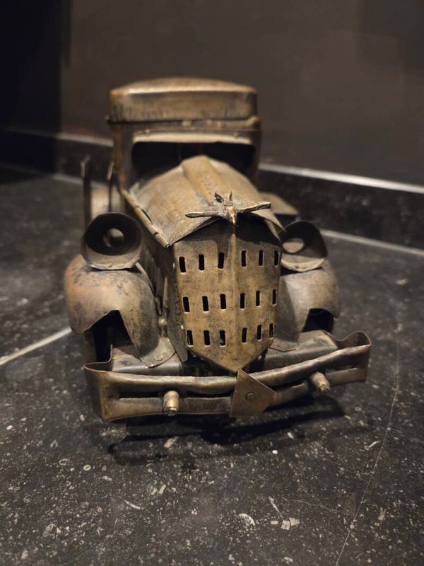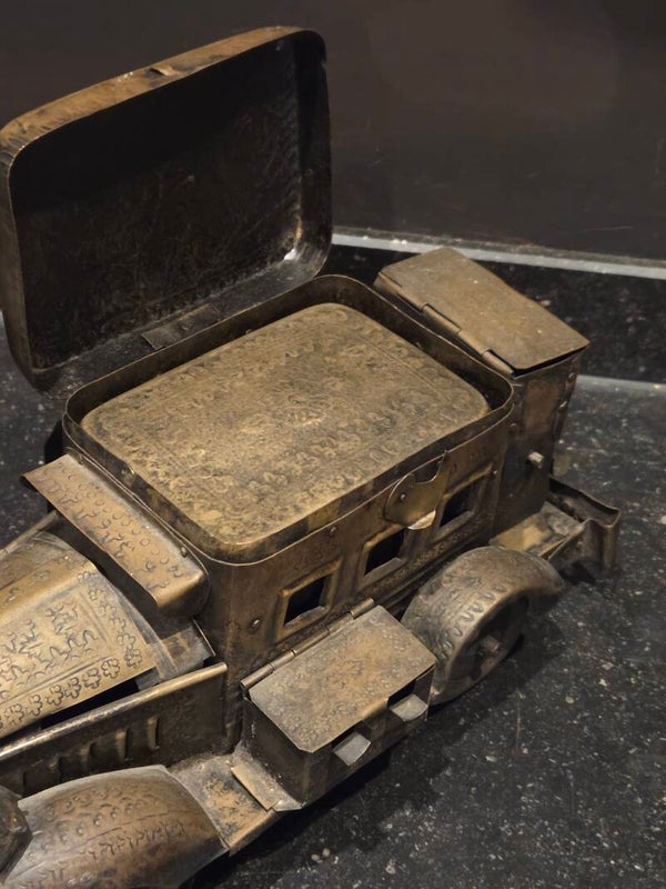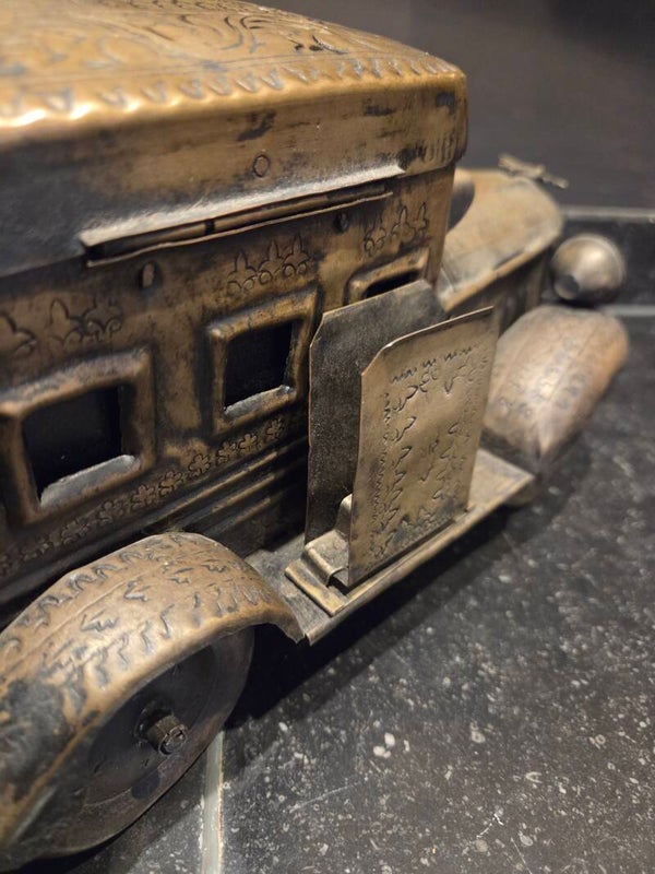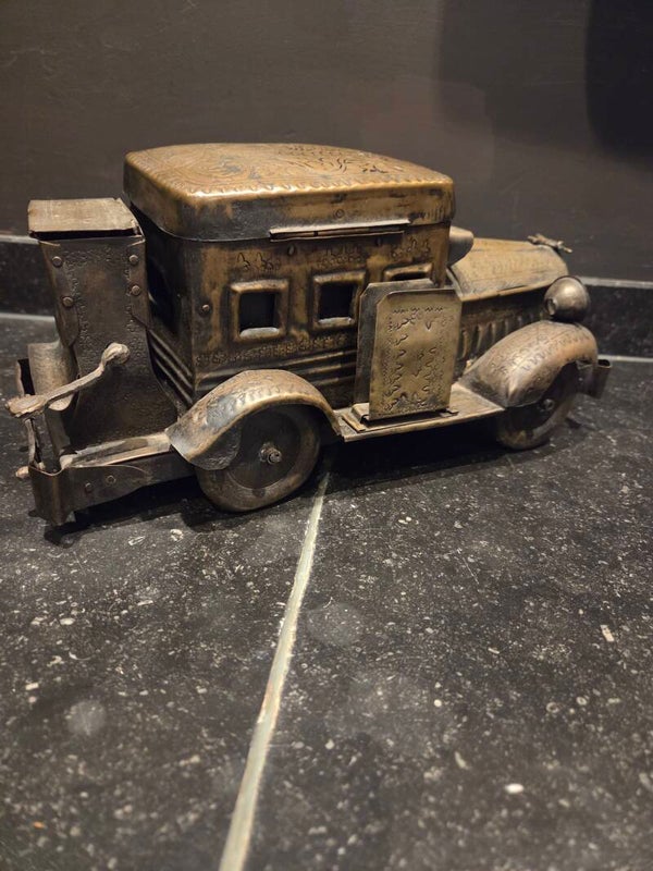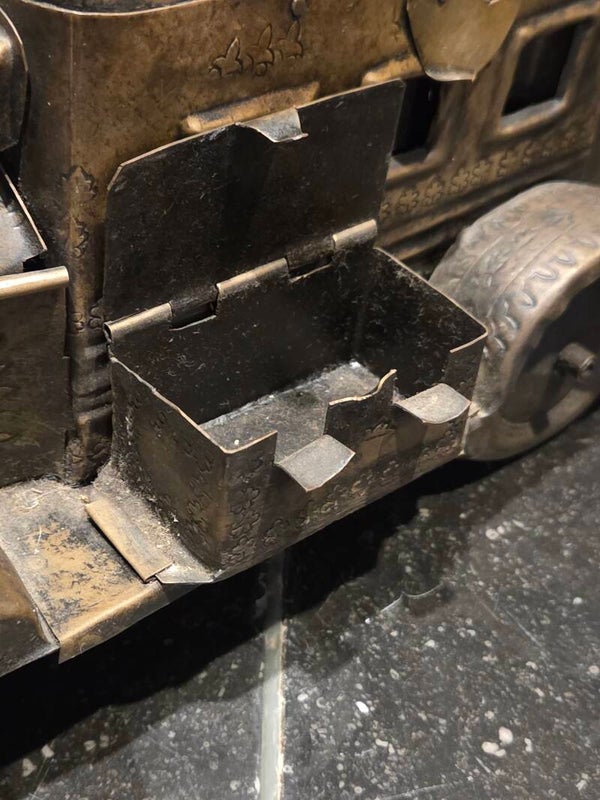 Oude messing auto voor rookgerief (lucifers, tabak, sigaretten rollen). Alle compartimenten kunnen open en bevatten ruimte voor rookgerei, aan de onderkant zit een oude pijp