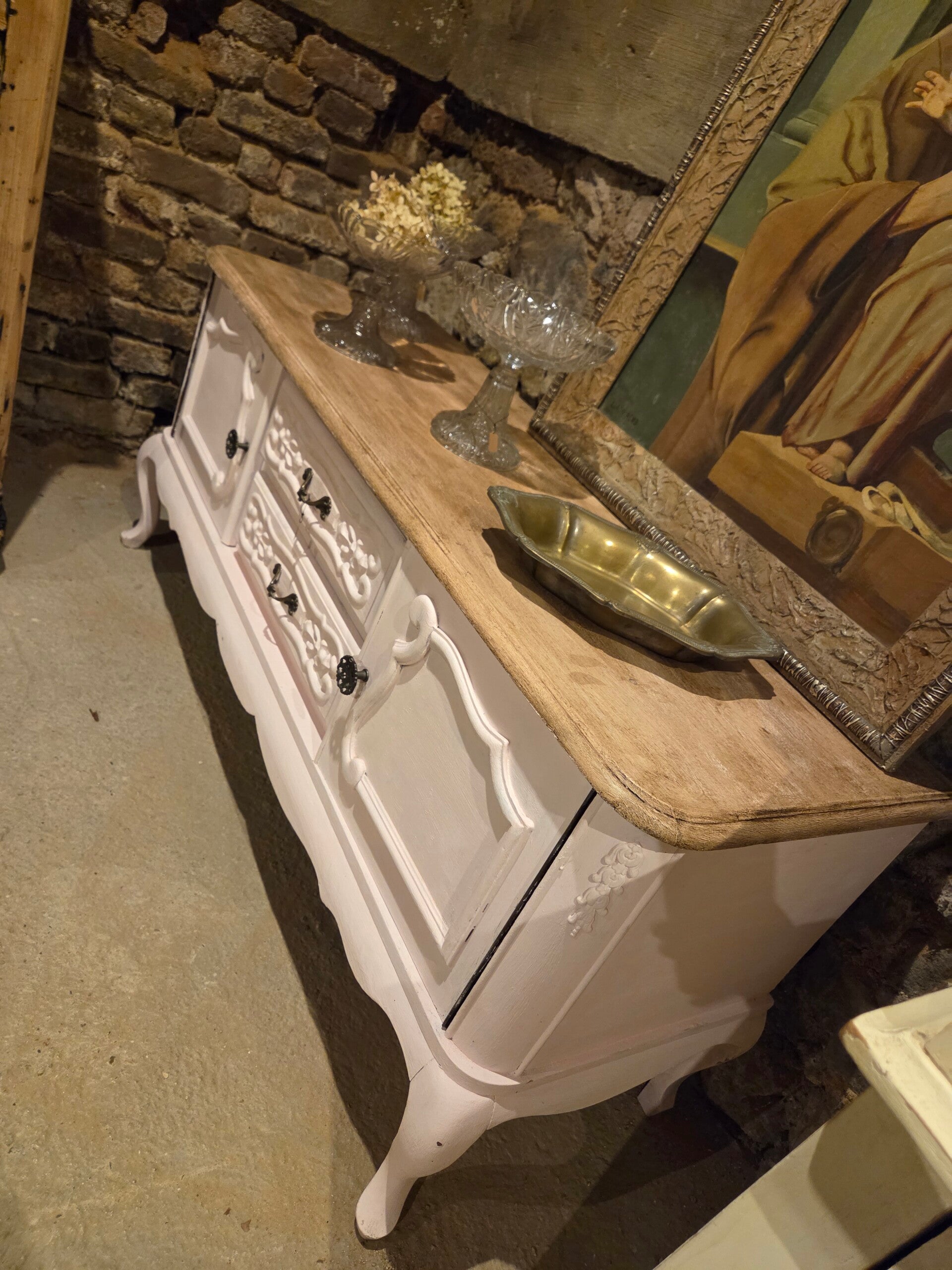 Vintage dressoir / kastje in een hele lichte, pastelroze kleur