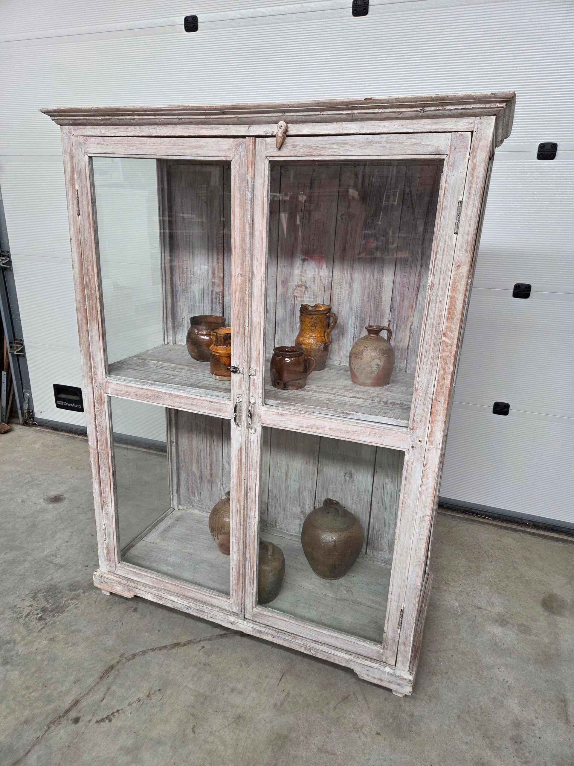 Prachtige brocante vitrinekast, echt een uniek stuk! In whitewash met een mooi patina