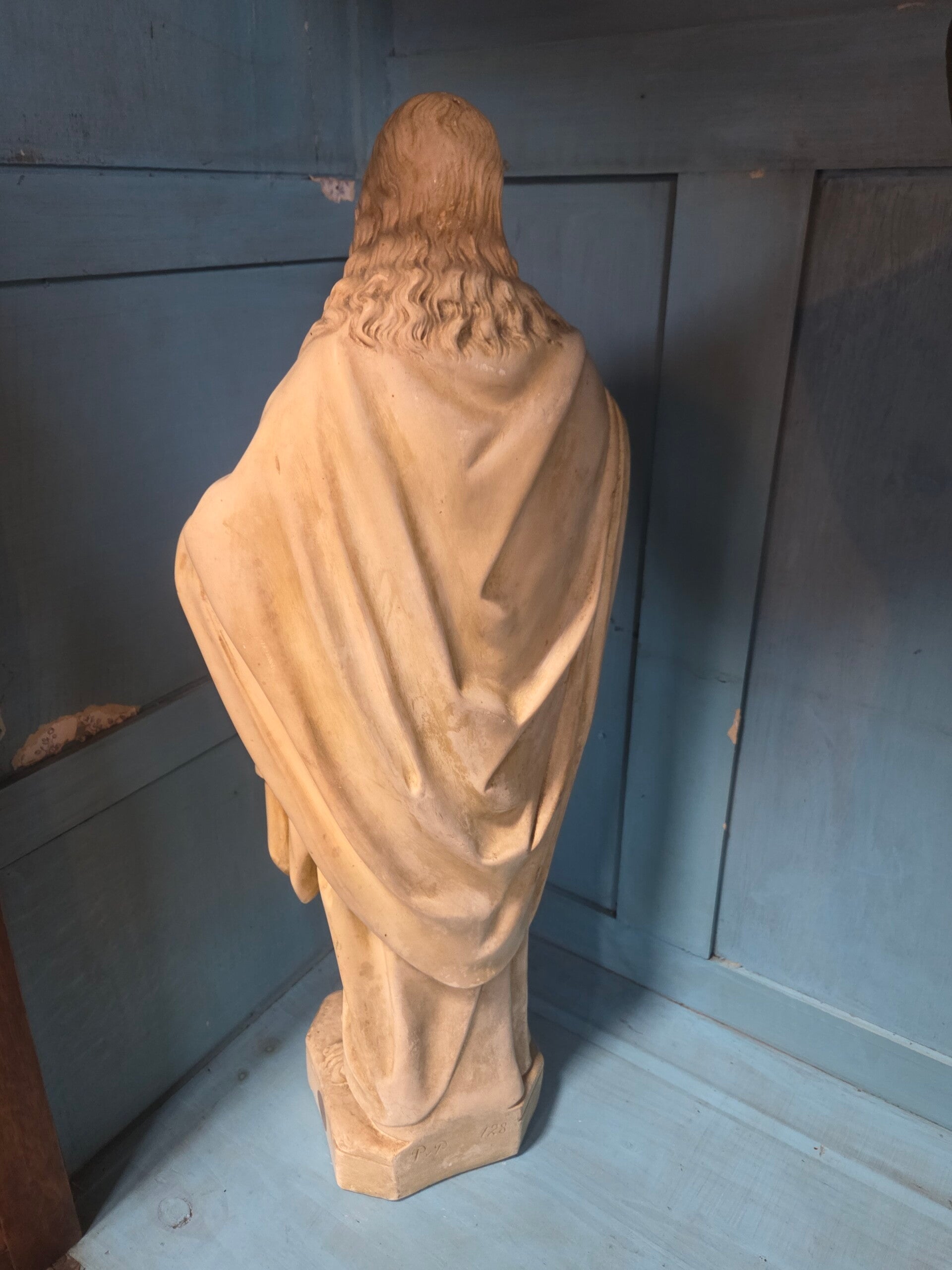 Heilig Hart-beeld, 68 cm hoog, handen ontbreken en hier en daar beschandigd door de tand des tijds